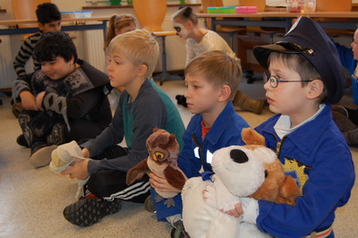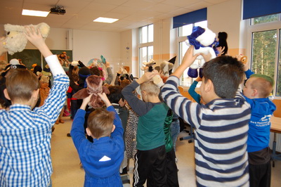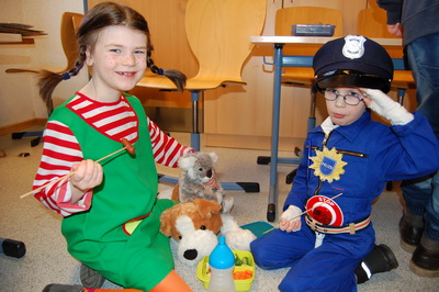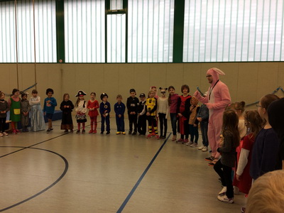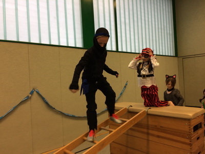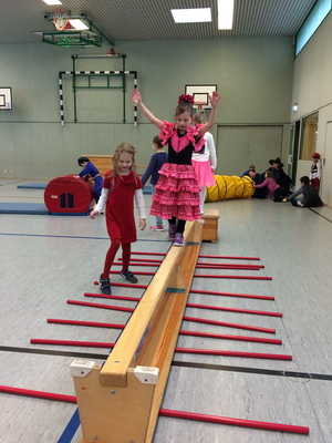 Wenn Katzen, Polizisten, Ritter und Prinzessinnen zur Schule kommen, dann kann das nur eins bedeuten: Karneval! Nach einem leckeren Spießefrühstück mit der Patenklasse ging es in die Sporthalle. Dort folgte als Aufwärmphase eine lustige Tanzeinlage. Danach wurde sich auf der von unserem Lehramtsanwärter aufgebauten Bewegungslandschaft ausgetobt. Katzen kletterten hoch bis unter die Turnhallendecke, Ninjas balancierten wagemutig über Sprossenhindernisse und Flamencotänzerinnen schritten anmutig über den Schwebebalken. Anschließend wurde noch ein Kuscheltiertanz eingeübt. Alle hatten ihren Spaß! |