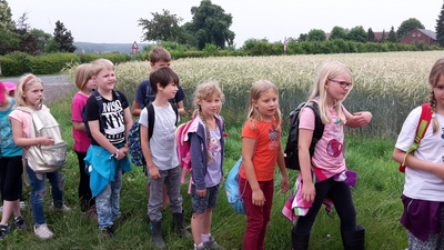 Bist du schon einmal Trecker gefahren? Wir schon, am 20.06.2018, zumindest im Anhänger. Mit viel Gekreisch ging es durch Felder und Wiesen. Damit uns nicht langweilig wurde und wir natürlich auch was lernen konnten, hielt Herr Schlensker zwischendurch immer wieder an und zeigte uns verschiedene Pflanzen. Hoffentlich können jetzt alle Gerste von Weizen und Hafer unterscheiden. Weißt du auch noch, woraus man Bier brauen kann? Während der Klatschmohn besonders hübsch aussah, duftete die Kamille sehr gut. Die Zuckerrübe müssen wir noch probieren. Auf dem Hof angekommen, begrüßten uns die Hunde überschwänglich. Dann hieß es erstmal auf der Wiese frühstücken. Das war auch gut so, denn nach dem Besuch im Schweinestall, hätten wir vielleicht nicht mehr essen mögen. Die Schweine sahen zartrosa und sauber aus. Gestunken hat es aber trotzdem. Ganz unruhig ging es im Hühnerstall zu. Das Gegacker nahm gar kein Ende und wie viel Eier die gelegt haben. Wahnsinn! Zum Schluss durften wir noch bei dem neugeborenen Alpaka vorbeischauen. Das sah vielleicht süß aus. Mit dem Trecker ging es wieder zurück zum Windrad und von dort gingen wir zur Schule zurück. Morgen wandern wir zur Freilichtbühne und am Freitag? Von uns aus, könnte es ruhig jeden Tag so weiter gehen.