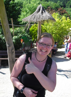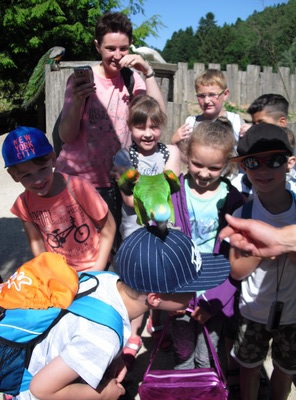 Nach  der Zooschule konnten wir Äffchen füttern und Papageien auf die Schulter  nehmen. Viele waren richtig mutig. Wer ein Cappy trug musste aufpassen, dass  der Papagei nicht auf den Kopf kletterte, denn die Knöpfe waren sehr  verlockend. Viel Zeit hatten wir auch zum Eis essen und Spielen auf dem großen  Spielplatz.