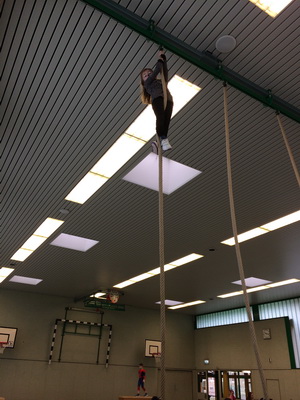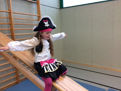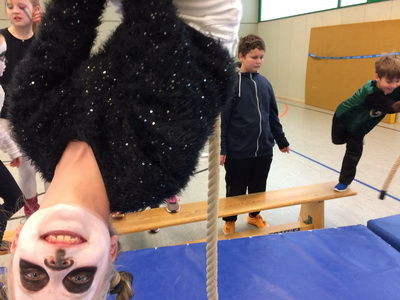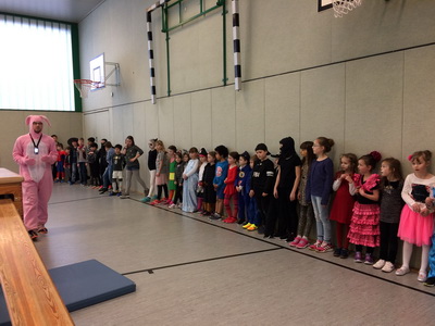 Wenn Katzen, Polizisten, Ritter und Prinzessinnen zur Schule kommen, dann kann das nur eins bedeuten: Karneval! Nach einem leckeren Spießefrühstück mit der Patenklasse ging es in die Sporthalle. Dort folgte als Aufwärmphase eine lustige Tanzeinlage. Danach wurde sich auf der von unserem Lehramtsanwärter aufgebauten Bewegungslandschaft ausgetobt. Katzen kletterten hoch bis unter die Turnhallendecke, Ninjas balancierten wagemutig über Sprossenhindernisse und Flamencotänzerinnen schritten anmutig über den Schwebebalken. Anschließend wurde noch ein Kuscheltiertanz eingeübt. Alle hatten ihren Spaß! |