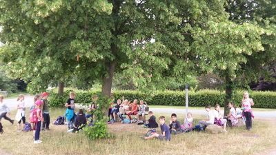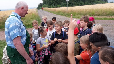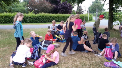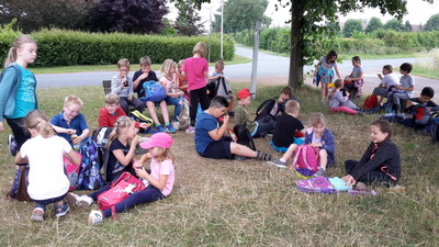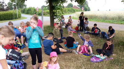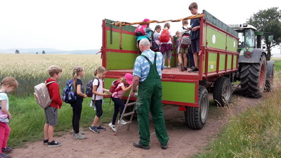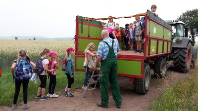 Bist du schon einmal Trecker gefahren? Wir schon, am 20.06.2018, zumindest im Anhänger. Mit viel Gekreisch ging es durch Felder und Wiesen. Damit uns nicht langweilig wurde und wir natürlich auch was lernen konnten, hielt Herr Schlensker zwischendurch immer wieder an und zeigte uns verschiedene Pflanzen. Hoffentlich können jetzt alle Gerste von Weizen und Hafer unterscheiden. Weißt du auch noch, woraus man Bier brauen kann? Während der Klatschmohn besonders hübsch aussah, duftete die Kamille sehr gut. Die Zuckerrübe müssen wir noch probieren. Auf dem Hof angekommen, begrüßten uns die Hunde überschwänglich. Dann hieß es erstmal auf der Wiese frühstücken. Das war auch gut so, denn nach dem Besuch im Schweinestall, hätten wir vielleicht nicht mehr essen mögen. Die Schweine sahen zartrosa und sauber aus. Gestunken hat es aber trotzdem. Ganz unruhig ging es im Hühnerstall zu. Das Gegacker nahm gar kein Ende und wie viel Eier die gelegt haben. Wahnsinn! Zum Schluss durften wir noch bei dem neugeborenen Alpaka vorbeischauen. Das sah vielleicht süß aus. Mit dem Trecker ging es wieder zurück zum Windrad und von dort gingen wir zur Schule zurück. Morgen wandern wir zur Freilichtbühne und am Freitag? Von uns aus, könnte es ruhig jeden Tag so weiter gehen.