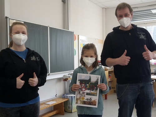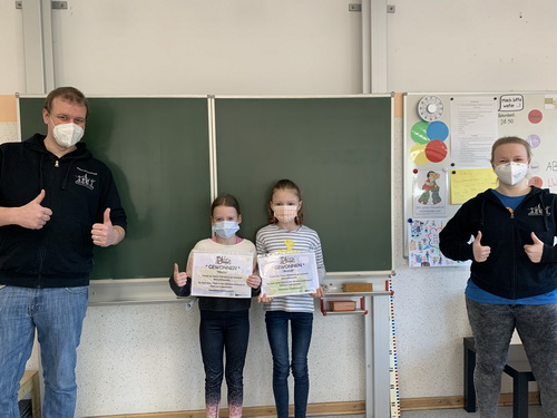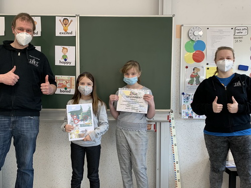 Der Malwettbewerb „Mein Bild von Porta“ rief alle Kinder und Jugendliche aus ganz Porta Westfalica dazu auf, ihr Bild von Porta zu visualisieren und künstlerisch umzusetzen. Fünf Kinder unserer Schule konnten sich unter den 166 Einsendungen durchsetzen und sind unter die besten zehn gekommen: Lina E. (3a), Anouk M. (4b), Liana M. (4b), Marie S. (4b) und Nadja W. (4b). Die Kunstwerke können im Rathaus II bewundert werden. Auch findet man eine Vielzahl der Kunstwerke im aktuellen Ferienpass wieder. Auf dem Foto sieht man die glücklichen Künstlerinnen mit ihren Urkunden, die durch die Jugendpflege überreicht wurden.